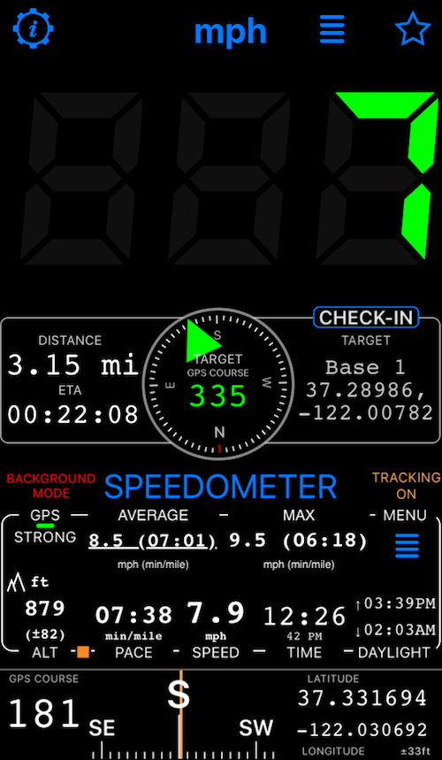 여전히 나침반, 목표 방향 화살표, 다양한 GPS 데이터를 제공하지만 속도에 집중합니다. 지도 대신 큰 속도 숫자가 표시되고, 트랙 타이머와 거리 대신 속도와 페이스의 평균/최대 값이 표시됩니다.