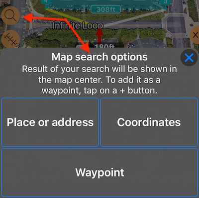#7 - 검색 버튼입니다. 주소/장소, 좌표 또는 기존 (웨이)포인트로 검색할 수 있습니다.