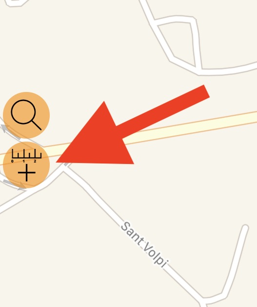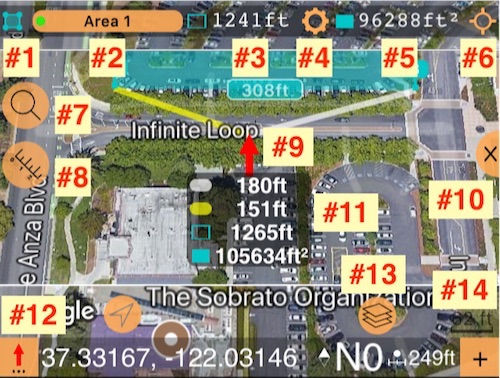 #14 - 지도 축척은 #14 아래에 있으며, ‘+’ 버튼은 빨간 화살표가 가리키는 위치에서 단일 탭으로 새 포인트를 추가할 수 있습니다.