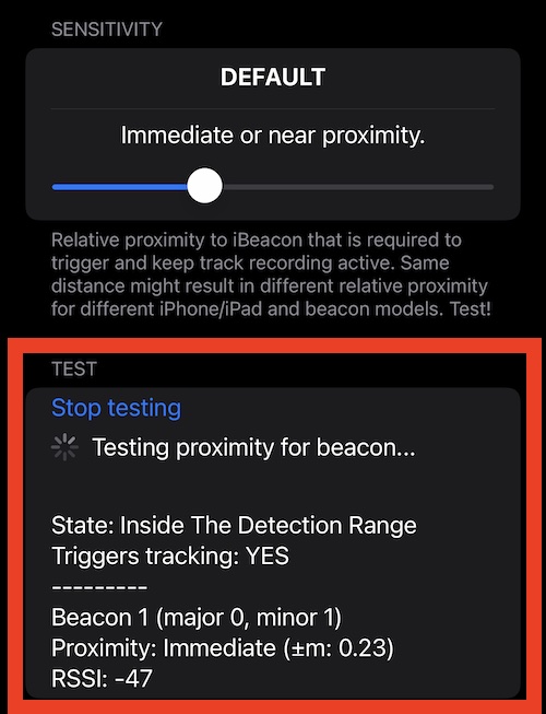 iBeacon이 매우 약하거나(또는 컴파트먼트에 숨겨져 있거나) iPhone(또는 셀룰러 iPad)의 블루투스가 매우 약한 경우 감도 슬라이더를 최고 위치(가장 오른쪽)로 이동하세요. 이 위치에서는 iPhone이 해당 UUID를 가진 iBeacon을 감지할 수만 있어도 트래킹이 시작됩니다. 비콘과의 근접성은 검사되지 않습니다.