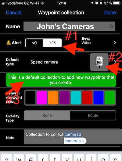 #2 - 이 컬렉션에 대한 기본 웨이포인트 유형을 설정하려면 여기를 탭하세요. 기본적으로 속도 카메라를 수집할 것이라면 속도 카메라 유형을 선택하세요.