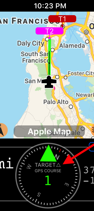 위 예시에서 대상까지의 필요한 경로는 335도이며, 지도의 경로선과 녹색 화살표가 이를 알려줍니다. 또한 이전의 “TARGET"이 이제 “TARGET⇡“로 표시되어 “항로"임을 알려주는 것을 주목하세요.