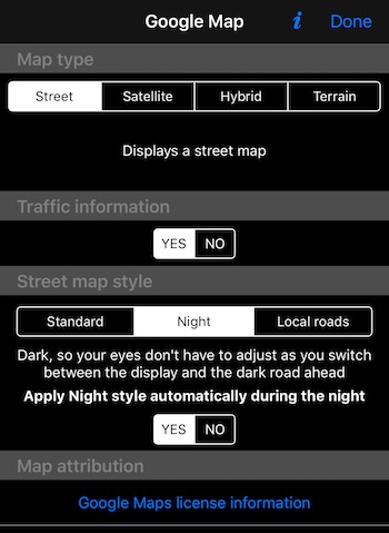 추가 옵션으로, 저녁/밤이 되면 Street 지도에 자동으로 Night 스타일을 적용할 수 있습니다. 앱은 현재 위치의 일출/일몰을 기반으로 전환 시점을 알게 됩니다.