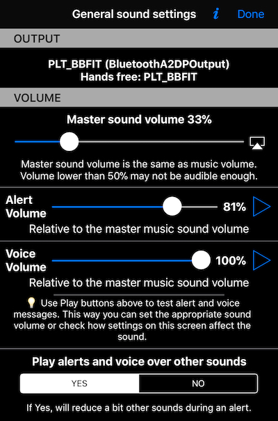 “알림 볼륨” 또는 “음성 볼륨” 옆의 “재생” 버튼을 사용하여 기본 설정 또는 이 화면에서 일부 설정을 변경한 후 사운드/음성이 어떻게 재생되는지 테스트할 수 있습니다. “출력” 섹션의 기본 출력 장치와 마스터 볼륨은 테스트 알림 사운드 또는 음성 메시지 동안 변경될 수 있습니다. 이는 iPhone의 사운드가 차량/헬멧에서 어떻게 라우팅되는지 이해하고 실제 사운드가 재생되는 장치의 실제 볼륨을 확인할 수 있습니다. 테스트 사운드 재생 중 마스터 볼륨이 너무 낮게 느껴진다면, 테스트 사운드가 재생되는 동안 여기서 마스터 볼륨을 조정할 수 있습니다.