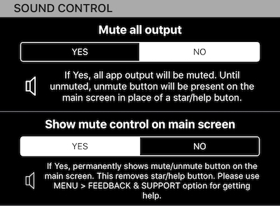 이 설정 화면 하단에는 앱의 모든 출력을 음소거/음소거 해제할 수 있는 옵션이 있습니다. 또한 메인 화면에 항상 음소거/음소거 해제 버튼을 표시할 수 있는 옵션도 있습니다: