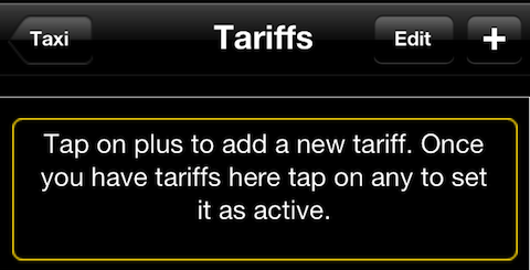 택시 여행을 시작하기 전에 요금제를 구성해 봅시다. 버튼 #1을 탭하면 요금제 목록이 비어 있는 상태로 표시됩니다:
