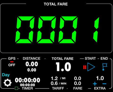 택시미터 화면은 다음과 같이 표시됩니다(큰 금액의 소수점 자릿수는 더블 탭 또는 설정에서 변경할 수 있음):