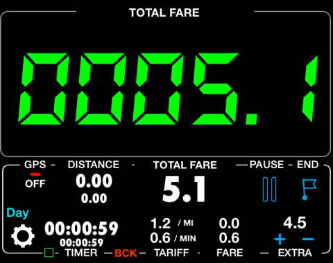 보시다시피, 이제 시간 청구는 0.6이며, 추가 요금 4.5와 시간 청구가 최소 요금을 초과했기 때문에 택시미터는 이미 5.1을 표시합니다.