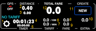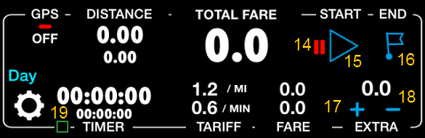 모든 카운터가 0으로 초기화되고 여행이 일시 중지된 상태(일시 중지 이미지 #14가 깜박임)임을 확인할 수 있습니다. 버튼 #15로 여행을 시작하거나 플래그 #16으로 중지할 수 있습니다. 트랙 표시기 #19는 이 택시 여행에 새로운 트랙이 생성되었음을 나타냅니다(우리에게는 중요하지 않음).