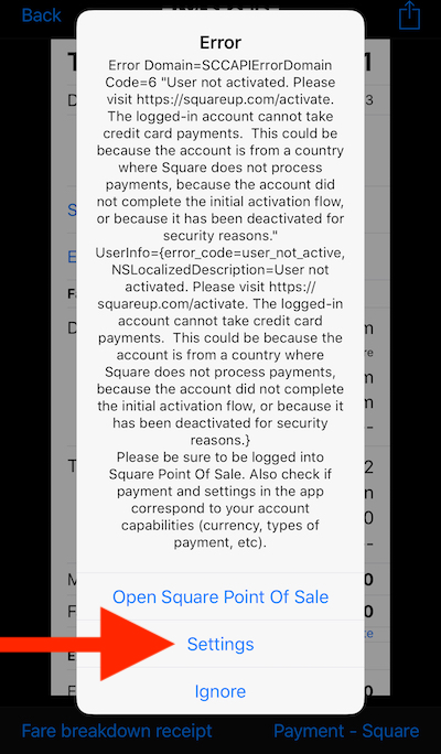 Square 오류는 항상 매우 상세합니다. “로그인한 계정은 신용카드 결제를 할 수 없습니다"와 같은 오류가 표시되면 “설정” 버튼을 눌러 Square 설정을 열어주세요: