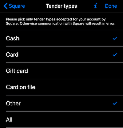 스퀘어 포인트 오브 세일 앱에서 오류를 방지하기 위해 텐더 타입을 올바르게 설정하는 것이 중요합니다. 여기서의 원칙은 Square 계정에서 사용할 수 없는 타입을 설정하지 않는 것입니다.