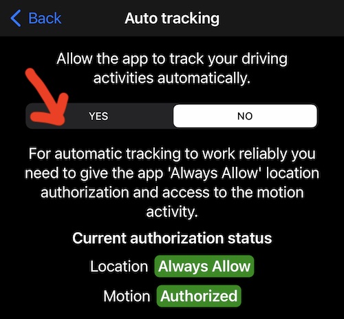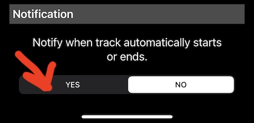 Może to być świetne poczucie, że aplikacja rozpoczęła trasę i wie, ile przejechała po jej zatrzymaniu. Wciąż na ekranie ustawień automatycznego śledzenia, przewiń do sekcji “Powiadomienia” i naciśnij TAK, aby być powiadamianym, gdy trasy są zaczynane lub zatrzymywane: