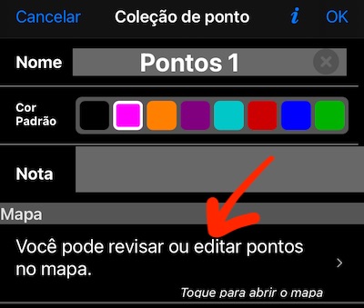 Para abrir um editor de mapas para a coleção, toque em um botão de MENU superior esquerdo> COLEÇÕES DE PONTOS> Toque em um botão de configurações na linha da coleção e, em seguida, em uma linha “Mapa”: