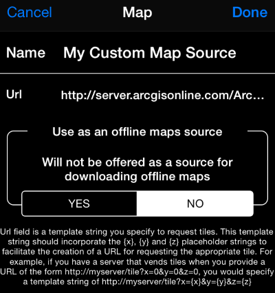 Please be sure to tell YES to “Use as an offline maps source” and use the url from the file I sent.