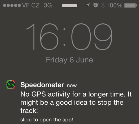 Speedometer can now notify you when you left it tracking onjust working in background and there was no GPS activity for a longer time. Setin “Advanced settings” > “Zero Speed or NOGPS”>“Background mode notification”.