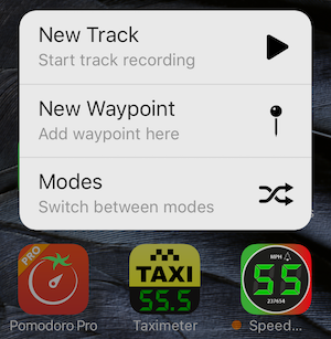 Modes are fast and straightforward way to transform speedometer to a tool of your choice. Heads-up, Taximeter, Rally Computer, Map, Waypoints monitor (e.g. speed cameras), Full screen map or speed, G-Force monitor or you can just resort to Default at any moment - that’s all available via force touch on the app icon or MENU>MODES: