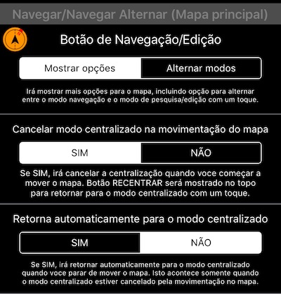Por padrão, o mapa agora cancela o modo de centralização quando você começa a movê-lo e você precisa tocar no botão “Re-Center” para voltar ao modo de centralização. Para alterar isso de volta para as configurações originais ou permitir que o mapa cancele o modo de centralização automaticamente, acesse as configurações comuns do mapa, abaixo: