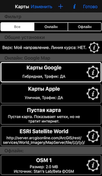 Карты в приложении разделяются на 2 категории - Онлайн и Офлайн.