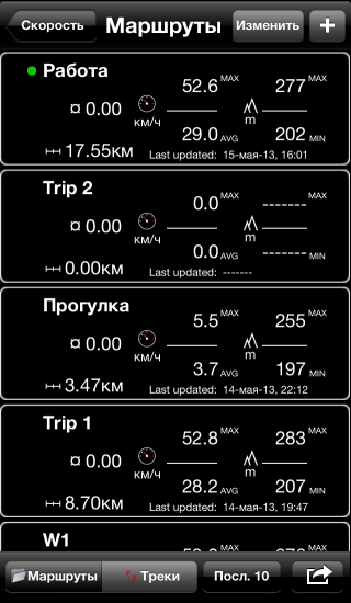 Для открытия списка треков и маршрутов опять нажмем над пометкой “МАРШРУТ”. Мы поездили (или походили) и теперь список треков уже не пуст: