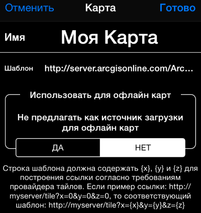 Загрузите карты дома через wifi и используйте без интернета когда нужно. Кнопка “+” в настройках карты предложит на выбор создать онлайн источник карты или офлайн карту. Так выглядит окно создания офлайн карты: