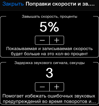 Показания показываемой и записываемой скорости теперь могут быть завышены на определенное значение в процентах. Сделано по просьбе инструкторов вождения, чтобы показания отвечали спидометру в машине, где, как известно, скорость часто завышена.