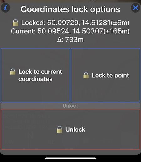“Konum kilidi” düğmesine dokunmak, kilitli koordinatları, mevcut koordinatları ve aralarındaki mesafeyi gösteren bir menü açar. Ayrıca “açma” veya şu anda mevcut konuma kilitleme veya farklı bir noktaya kilitleme seçenekleri de vardır: