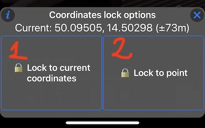 Ayrıca uygulamada bir nokta oluşturabilirsiniz (MENÜ > NOKTALAR> + düğmesi), haritada istediğiniz herhangi bir noktaya yerleştirin ve ardından koordinatları bu noktanın konumuna kilitleyin. Bu seçenek, koordinatları herhangi bir değere ayarlamanıza, haritada arama yapmanıza vb. olanak tanır - çünkü bu, nokta düzenleyicinin sağladığı seçeneklerdir. Böyle bir nokta ayarladıysanız, o konum kilidi düğmesine dokunun, “bir noktaya kilitle” seçeneğini seçin ve tam fotoğraf oturumu konumu için önceden hazırladığınız noktaya dokunun.