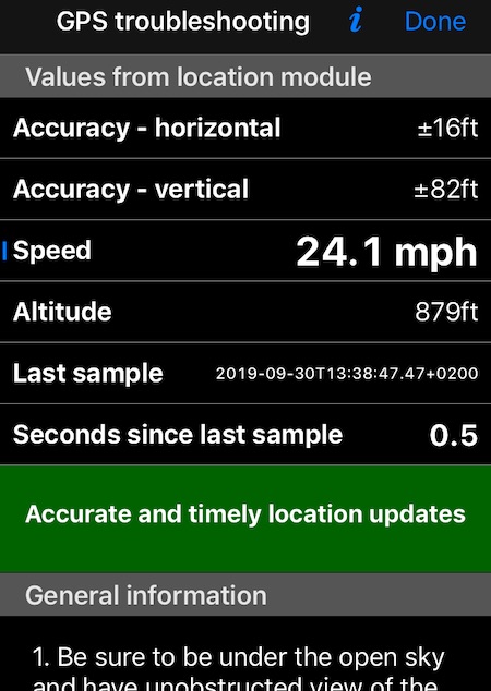 Konum modülünden gelen ham değerleri görüntülemenizi sağlar. Böylece güncelleme sıklığını, yatay ve dikey doğruluğu görebilir ve bunları bulunduğunuz ortamla ilişkilendirebilirsiniz. Ya tren ya da uçakta olun, ya da iPhone’daki geçici GPS alıcı sorunları olsun - burada analiz edilecek değerleri ve başlangıç için bazı rehberlikleri bulacaksınız.