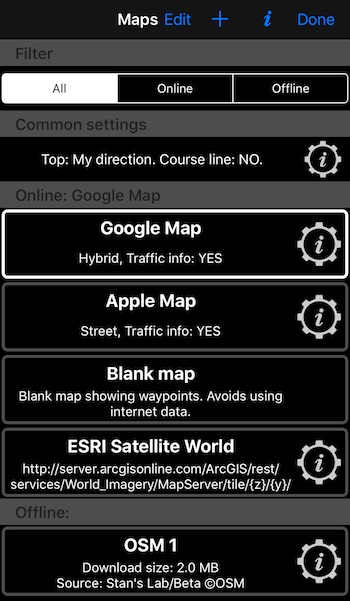 Uygulamadaki haritalar Çevrimiçi veya Çevrimdışı olarak kategorize edilir. Dahili Google ve Apple haritaları Çevrimiçi kategorisine aittir ve ayrıca kendiniz ekleyebileceğiniz Özel URL haritaları da bu kategoriye girer.
