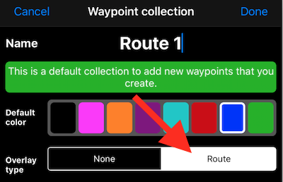 Tek bir hedefe navigasyon yapmak için her zaman olduğu gibi bir waypoint oluşturun. Rota navigasyonu için uygulama içinde bir rota oluşturabilir veya GPX rota (rte) içe aktarabilirsiniz. Uygulamadaki her waypoint koleksiyonu, koleksiyon türünü “Rota” olarak değiştirmekle kolayca bir rota haline getirilebilir: