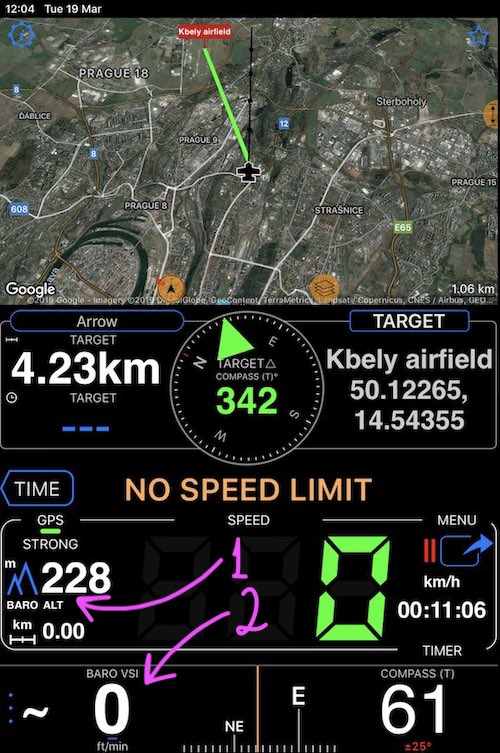 Paraşütçülük ekranı, harita, hedefe ok, yatay ve dikey hızlar, barometrik yükseklik veya yükseklik (QFE ve QNH) seçenekleri, pusula içerir. Görünüm şöyledir: