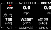 Kırmızı renk ve OFF değeri, konum doğruluğunun hızı hesaplamak ve göstermek için yeterli olmadığı anlamına gelir. Sol taraftaki resim wifi tabanlı konum çözme örneğidir. Karakteristik doğruluk yaklaşık 65 metredir (200 ft). Bu durumda yükseklik değeri de sağlanır.