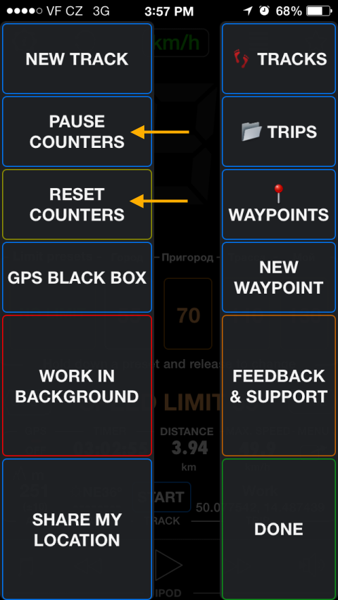 Her arabadaki yolculuk sayacı veya kilometre sayacı (birkaç sayacın olabileceği) vardır. Hız ölçer uygulaması da sayaca sahiptir. Sayıları MENU butonu aracılığıyla kontrol edebilirsiniz: