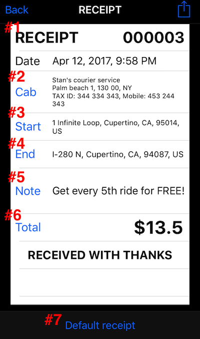 #5 Makbuz notu. Bu makbuz için not girmek için “Not” düğmesine dokunabilirsiniz. Ayrıca, belirli bir makbuzda üzerine yazana kadar kullanılacak “önceden hazırlanmış” metinleri ayarlayabilirsiniz.