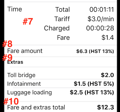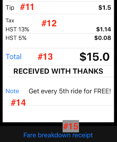 #13 Toplam. Bu bir alan ve düğmedir. Toplam tutarını ayarlamak için düğmeye dokunun. Tarife $9,4 iken müşteri $10 söylüyor ve faturada bunu görmek istiyorsa, bunu kullanın.