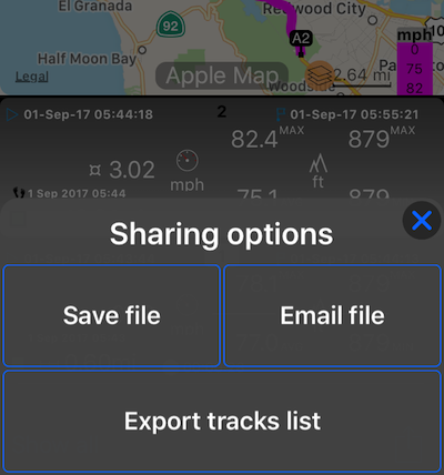 “Save file” sẽ cung cấp lựa chọn định dạng chia sẻ (toàn bộ “Tập tin chuyến đi” hoặc Google kmz) và cung cấp lưu vào iCloud, Dropbox, v.v. Tùy chọn “Email file” chỉ cung cấp tùy chọn email.
