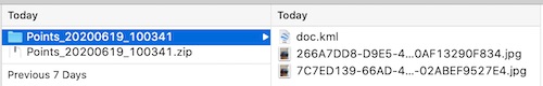 KMZ 檔案實際上只是一個 ZIP 檔案。將副檔名改為 .zip,解壓縮後,在解壓縮的資料夾中將找到 doc.kml XML/文字檔案,其中包含所有照片/點的資料,以及所有匯出的照片。