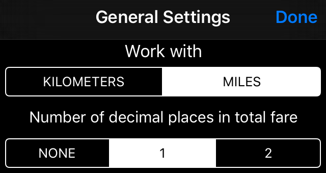 文檔 計程車計價器 設定計程器以英里(mph)或公里(km/h)為單位運作。 設定計程器以英里(mph)或公里(km/h)為單位運作。 點擊設定按鈕以開啟一般應用程式設定: 您可以在此設定速度計是否以英里或公里計量並計費,以及總車資的小數位數: